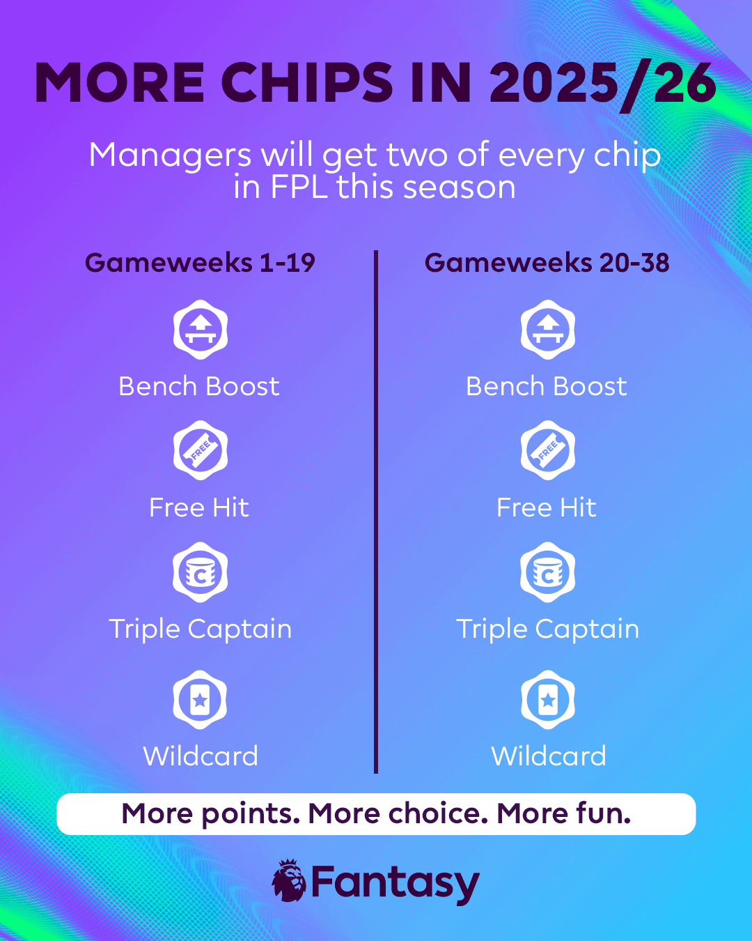 We will now receive two of EVERY chip this season, one for each half of the season. You will have a Wildcard, Free Hit, Triple Captain and Bench Boost chip to use in each half of the campaign, meaning eight chips in total. There will be no Assistant Manager chip in Fantasy this season.