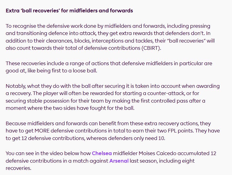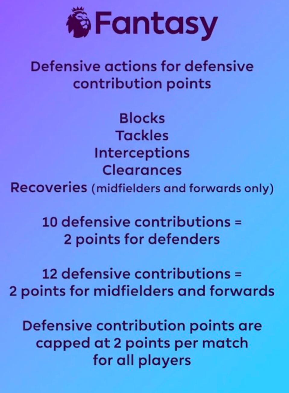 - Midfielders and Forwards: Will also be rewarded, with "ball recoveries" added to their criteria (CBIRT), but they will need to achieve 12 defensive contributions to earn two FPL points.