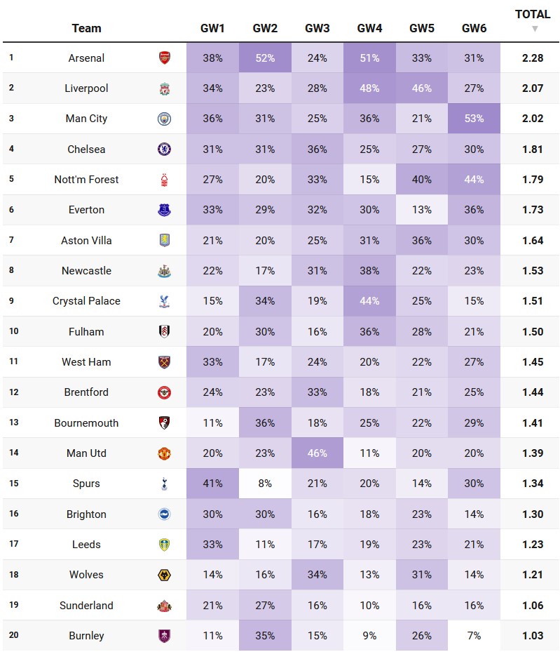 Elevenify produced a really nice graphic I came across with the clean sheet probabilities for the opening 6 gameweeks, which is a solid window to plan for, and over that run Arsenal are top, hence the double-up, despite some potentially tricky fixtures.