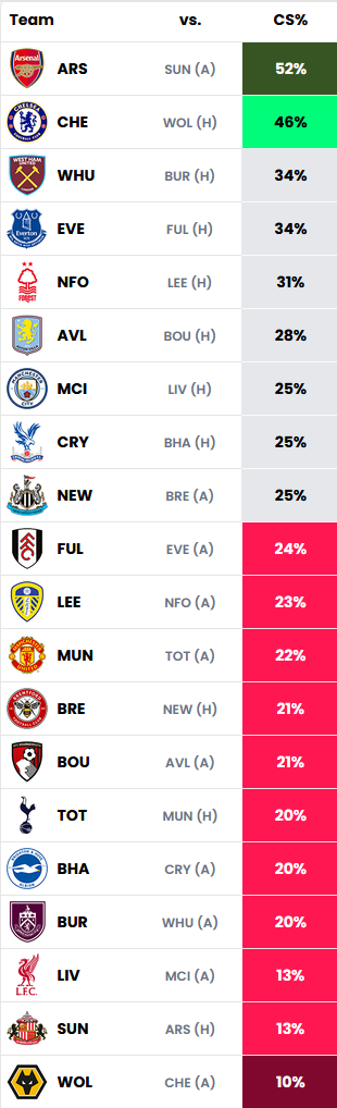 - Arsenal top the clean sheet odds again this week, 52% chance vs Sunderland. Chelsea are second with 46%, West Ham and Everton 34%. Palace on 25% though with Munoz it's the possible goal involvements as well. The only thing about that Munoz transfer last week is my defence will potentially look a bit light in some future gameweeks having sold Senesi. He's the sort of player than can single handedly save a bad gameweek though, for example in a low scoring week if he gets a goal or assist plus clean sheet it's an instant double digit return.