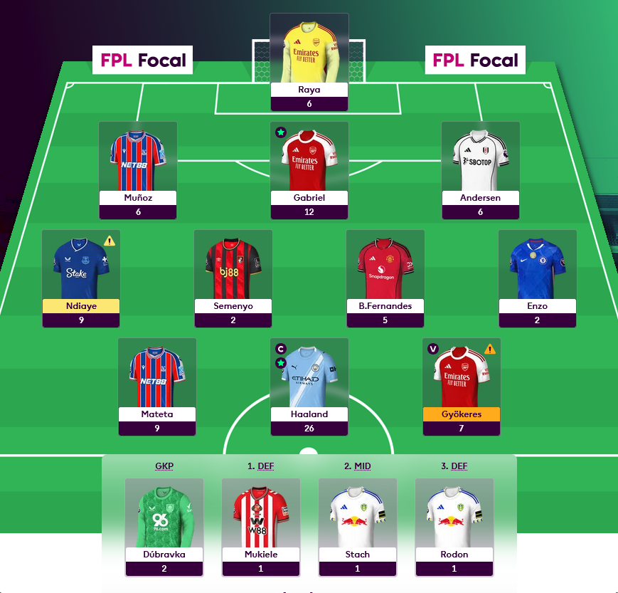 The climb continues! 90 points all out, a really good GW10 with only 2 blanks across the whole team - Semenyo and Enzo. A rare clean sweep at the back with Raya, Gabriel, Andersen and Munoz who I transferred in all keeping clean sheets. Bruno assist, Ndiaye scoring Everton's only goal earning himself bonus, Gyokeres goal, Mateta also joined the team and scored then of course the Haaland brace. 🤩