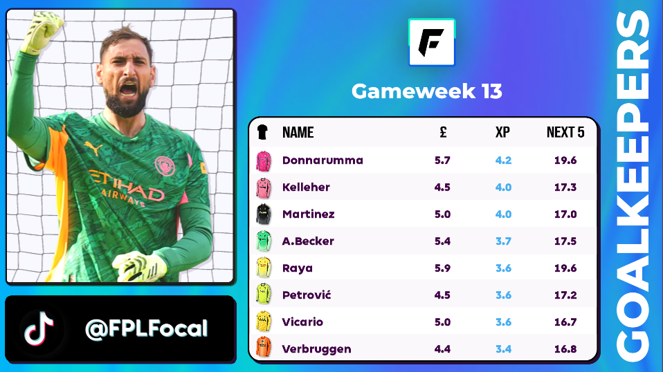- Therefore it's Donnarumma top of the table this week on 4.2 projected points, an immediate response needed after the loss to Newcastle, and despite that loss where they conceded 2.2 xG to Newcastle, they're still the second best team for xGC after 13 games played. 12.68 xGC, only Arsenal are ahead with a ridiculously low 6.21 xGC.