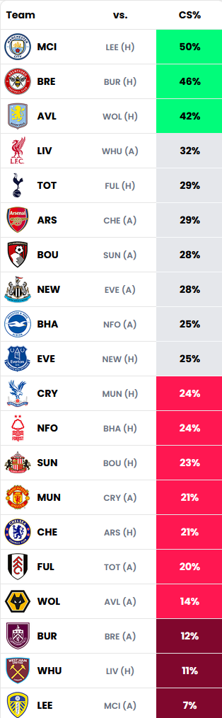 Liverpool are fourth on the clean sheet odds, given just a 32% chance mind. Sunderland are further down on 23% and it looks like I may need to call upon Mukiele again. In fairness it's a home game and apparently Sunderland is not an easy fixture, though my team is quite awkwardly set up this week with 2 of my defenders and Raya facing 3 of my attackers.