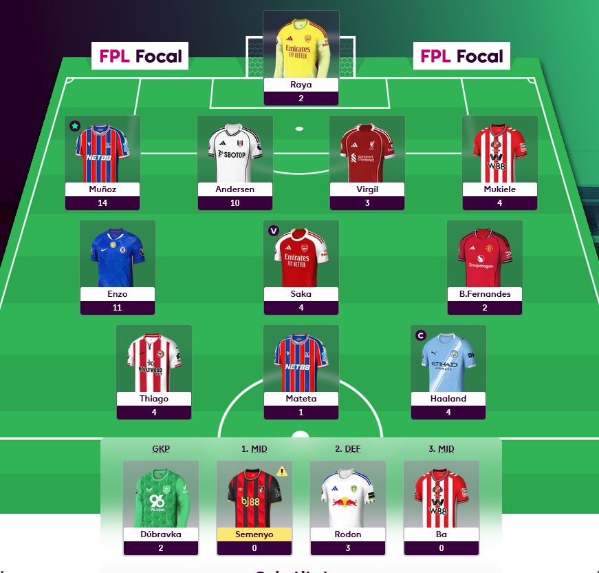 A really solid gameweek with 59 points saw the team rise to 71K overall. Carried by 3 players entirely, Munoz, Anderson, and Enzo with double-digit returns. Munoz with the goal, clean sheet, and max bonus, exactly what I bought him for. He's one of those players who can be a difference maker in a gameweek. In fairness Lacroix did well too, who I'd looked at when deciding where to go with the Palace defence.