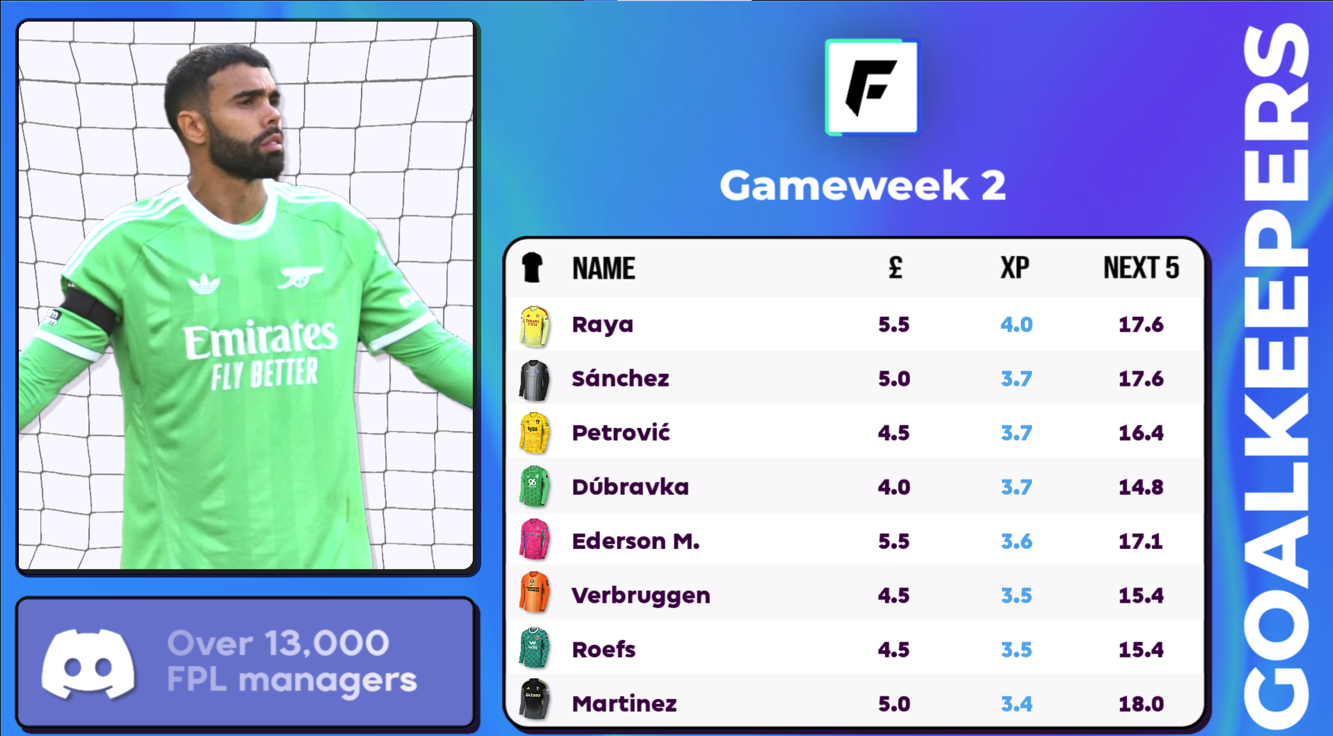 Realistically you shouldn't be looking at a keeper transfer unless on a free hit or a wildcard, but there's still a lot to be learned even if this isn't the week you're looking that way. The standout fixture is Arsenal home to Leeds which has Raya top on 4 points this week. If I was using a chip this week he would be in my team without question.