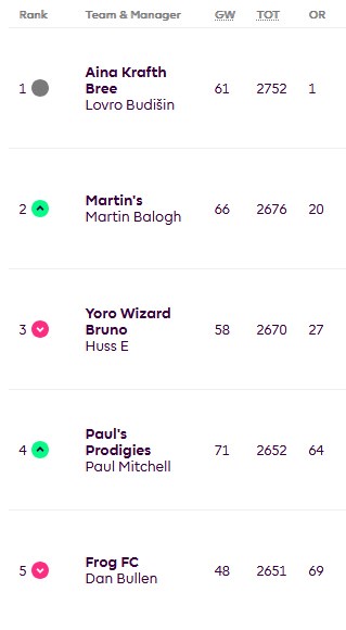 54 points last gameweek then, a red arrow by a margin of 4 points, or in other words had Saliba not gone off injured it would have been a green arrow. Although Gvardiol conceded that was actually beneficial to rank; in the top 10K he's 95% owned and Ruben Dias about 15%, so Manchester City clean sheets are no help at this point. Mbeumo's missed penalty was actually beneficial to rank as well, given he was over 100% effective ownership. Martinez kept his 3rd clean sheet on the bounce. Loads of assists from Rogers, Mbeumo, Sarr, captain Watkins, and Wissa with 1 goal and 1 assist himself. 800,000 transfers in for Watkins who just came away with the 5 pointer in the end.