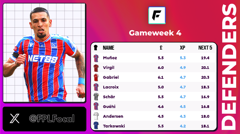 If I was wildcarding what would my defense be? Munoz, Gabriel, and Andersen would definitely be in, and for the last two spots there's so many options. Double Palace defense with Lacroix looks good, and I like Senesi a lot for £4.6m. Konsa is potentially value for £4.5m with Everton, Sunderland, Fulham, and Burnley his next four.