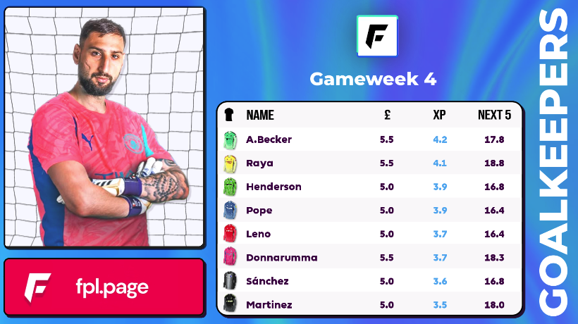 The stand out fixture is certainly champions Liverpool facing promoted Burnley away, which has Alisson top of the table on FPL Review. Looking at the next five games, however, Raya leads, so if you're going for any premium keeper he's the one for the longer term. Though we've had a new £5.5m keeper added, Donnarumma. Is he worth buying? 🧐 Interestingly, he comes in joint fourth for GW4 and second only to Raya for the next five.