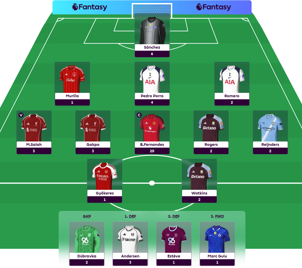 Well what an underwhelming gameweek it was before the break, 46 points and no rank movement. Missed all the action on Saturday's games at a wedding, Bruno's late goal, Sanchez keeping a clean sheet after the controversial King goal ruled out. Sunday I was buzzing for the games with Reijnders, Murillo, Salah, Gakpo, Rogers, Gyokeres, Watkins all to play and not a single one of the 7 players returned. It's when the highly owned assets return that it becomes a killer, Joao Pedro in particular scoring, Haaland scoring, Van Dijk clean sheet. But yeah the major positive was Bruno captain for the 20 pointer. I'm quite looking forward to this gameweek for a number of reasons though, the big decision is whether to cut the losses with Rogers and Watkins or not. 🤔