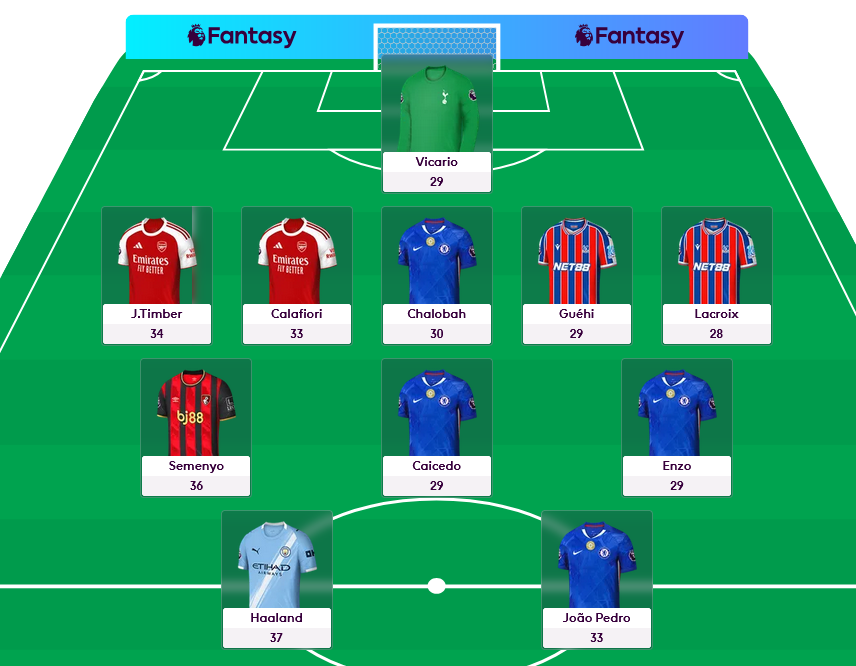 As a consequence, the team of the season is a 5-3-2. Vicario, Timber, Calafiori, Chalobah, Guehi, Lacroix, Semenyo, Caicedo, Enzo, Haaland, Joao Pedro. Including defensive contributions, Caicedo has returned in every game as well.