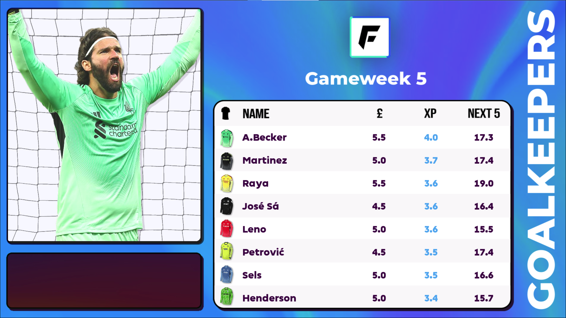 First, and this week Alisson tops the table, facing Everton at home for the Merseyside derby. 🏡 However, Alisson is a very good example of where the next 5 projections column comes in handy; long term, Raya is in front on 19 points vs Alisson's 17.3. If you're making a keeper transfer or wildcarding, Raya would be my pick. 🎯 It's not often we make keeper transfers, and when one joins our team it's therefore with a very long-term view. On average, it's always the lowest-scoring position and therefore it's not an area worth spending transfers on most of the time. I've always found goalkeepers to be so unpredictable as well; the premiums rarely finish as the top-scoring keeper because the cheaper ones face more shots that make up the difference in slightly reduced clean sheets. Even then, teams can have a bubble season and do well, such as Sels, who I think shared the golden glove with Raya last season. Wolves face all three promoted teams in their next 5, which has Jose Sa on 16.4 points. I really don't have much confidence in the Wolves defence personally though, so I'd rather find the 0.5m for Martinez or Petrovic over Sa.