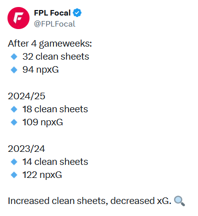There's an interesting trend of increased clean sheets; we've had 32 already from 4 gameweeks, an average of 8 per gameweek. Last season at this point we'd had 18, so 14 fewer. The season before that we had 14. Non-penalty has also decreased year on year the last 3 seasons, at this stage. Is "big at the back" back, particularly with defensive contributions in mind? 🤔