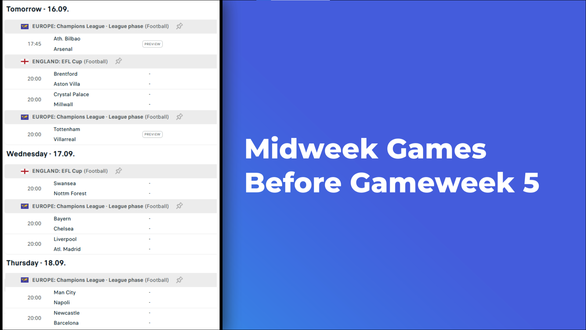 As a reminder, this week European football starts, so the sensible thing to do is wait before making any transfers. The following teams all play before GW5: Arsenal, Brentford, Palace, Tottenham, Forest, Chelsea, Liverpool, Man City and Newcastle. A few League Cup games in there as well. Injuries are unpredictable and you never know when it might happen to your team, it could be in one of these games if you're very unlucky, and therefore that's why waiting is sensible, though of course there might be times where you have exact money for a particular move and then you have to make a judgment call on it. ⚖️