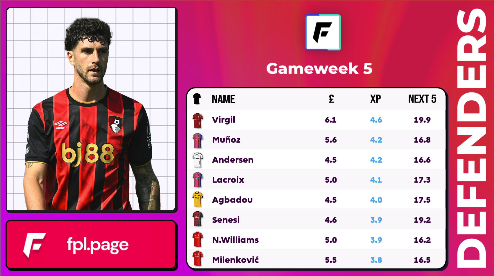 Next, and it's a Liverpool player top once again, Van Dijk with 4.6 points on FPL Review. Back-to-back 8 pointers for Virgil and very good clean sheet odds for GW5. Only 0.13 xG conceded last match. Liverpool won 1-0 in the same fixture last season, 2-0 the year before, 2-0 the year before that. It's the away games vs Everton that have been unpredictable historically. Munoz and Lacroix make the table again this week, though I'd actually swerve unless you desperately need a defender for one week. They have West Ham away, after which point they have Liverpool and Arsenal in the four gameweeks to follow. 😬