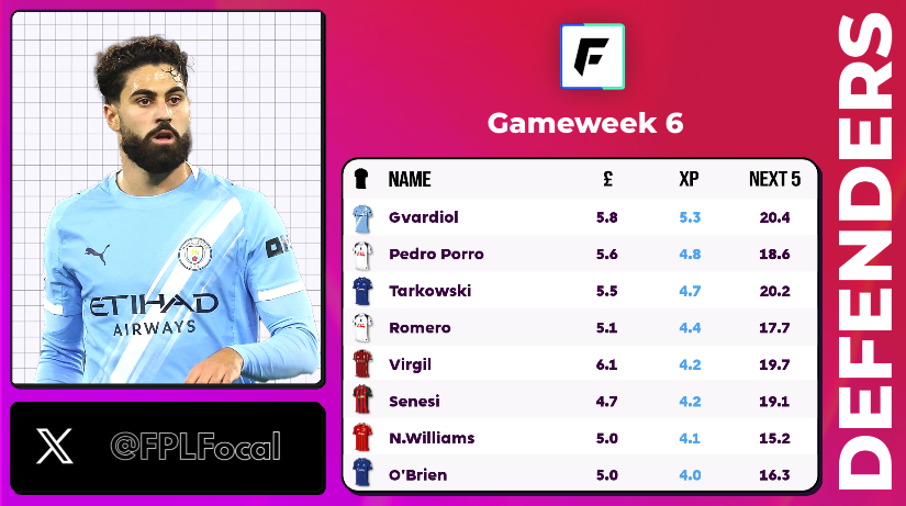 Defenders next and the list is Gvardiol, Pedro Porro, then Tarkowski this week. We were talking about Gvardiol in the transfer plans article, and how nailed he is. He's just back from injury not long ago, but certainly one of Pep's favorites, favored in LCB in a 2, arguably their best LCB in a 3 as well, plus he can play left back, though Ait-Nouri and O'Reilly are competing there too.