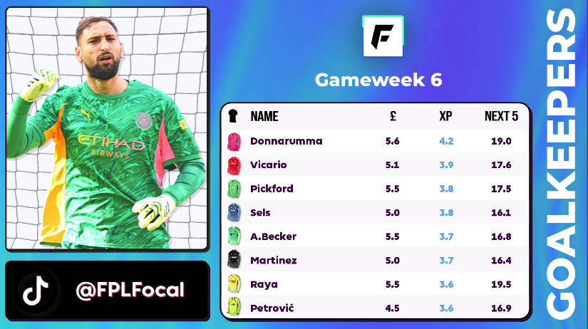 First up are the goalkeepers, and of course it's Man City home to Burnley, the fixture you won't stop hearing about this week. That places Donnarumma top for GW6, almost consecutive clean sheets since making his debut if not for a brilliant lobbed goal by Martinelli in stoppage time. My wildcard is active and I'm giving some serious thought about which goalkeeper is the one long term, it could be 15+ gameweeks until the second wildcard so it's a big call to make and my favorite two are Donnarumma and Raya. They're above the rest for next 5 projections, though of course as I say we're actually talking more than just next 5 with keepers, they're the position that gets by far the least transfers spent.