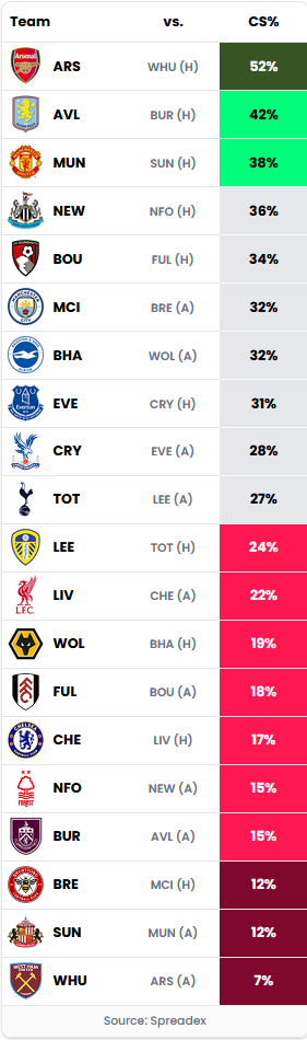 Looking at the GW7 clean sheet odds on the app, Arsenal's 52% is comfortably top this week, the only team likelier to keep one than not according to the markets.