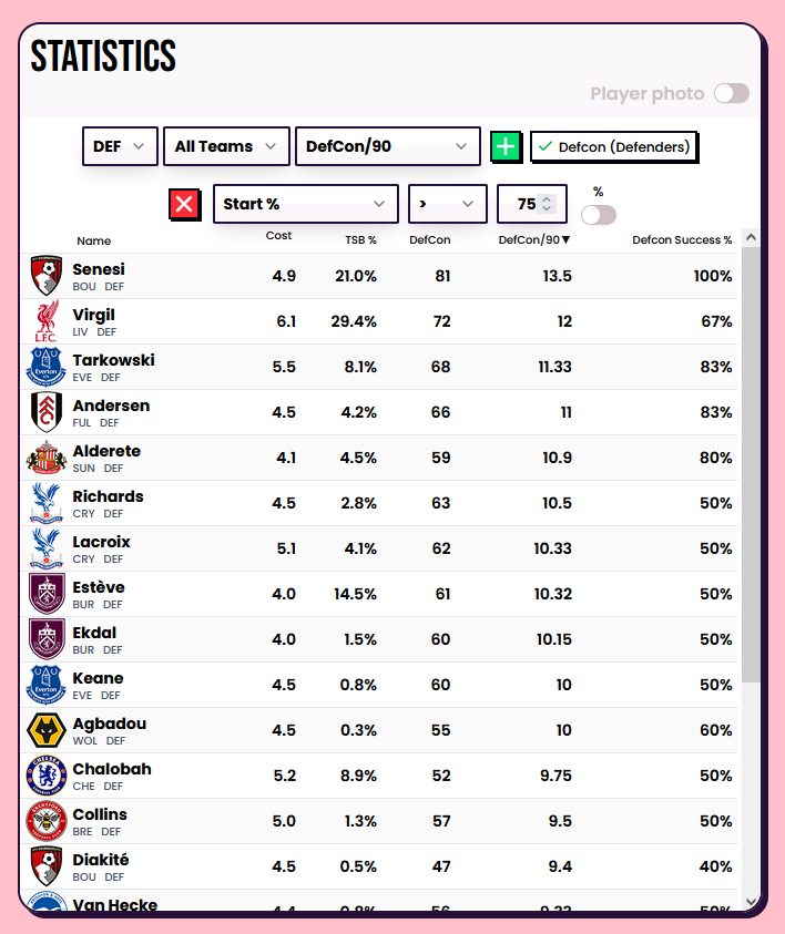 The default on the preset is players that have started more than 75% of games. If you bring it down to 60%, you include players like Mukiele who joined up later; he wasn't in the game until GW2 and started in GW3. 12.75 dcs/90 places him just behind Senesi.