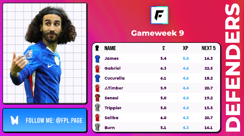 On the subject of Chelsea's fixture run, James and Cucurella are on the table. An 18-pointer for James last match: 1 goal, 1 assist, 1 clean sheet, 3 bonus points. Was discussing him in the transfer plans article—I just can't trust him to play every game; he's started 5 of 8. They're managing him very well, it must be said, but it is risky. Cucurella is the one. Chalobah also deserves a mention, who has started every game besides when he was suspended.