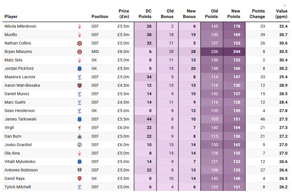 Aina's in my team currently, though as some of you quite rightly pointed out last article they've now got to juggle European football which is a massive step up for a team that haven't been there in decades, and they've lost Elanga and presumably Gibbs-White. He does offer a £0.5m saving over Milenkovic and Murillo though, but likely gets fewer defensive contribution points. This table shows how players would've scored differently had the new rules been in place last season. Milenkovic and Murillo are the two highest value points per million players on last season's data, with 26 and 38 DC points each. Huge beneficiaries from the changes.