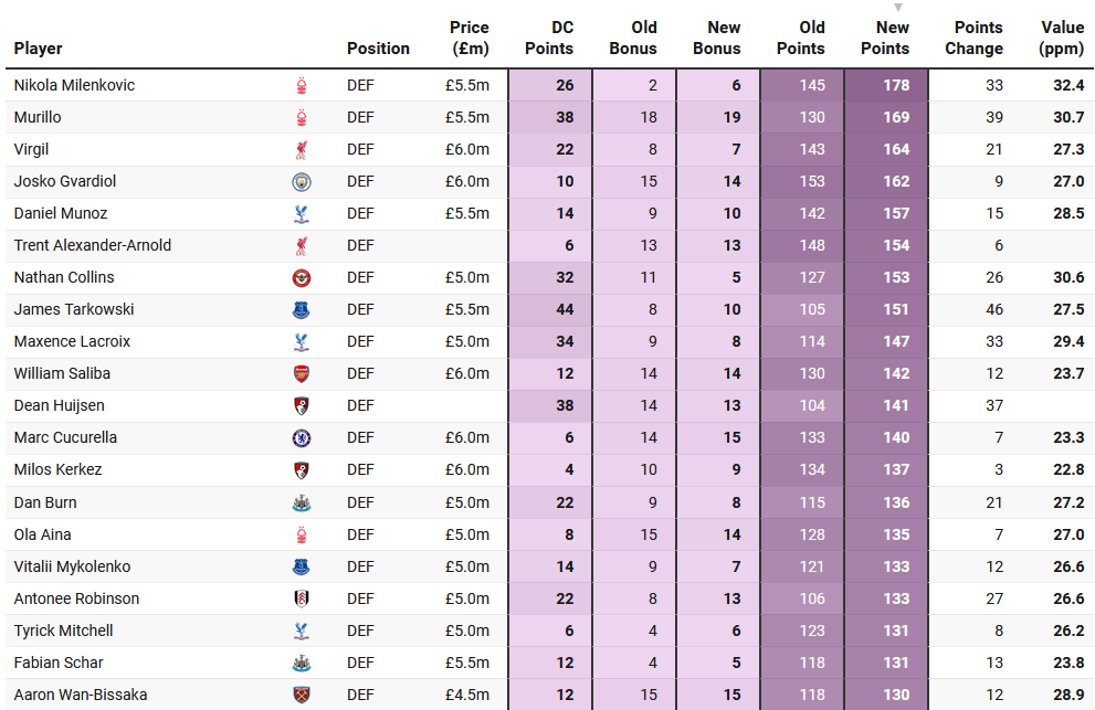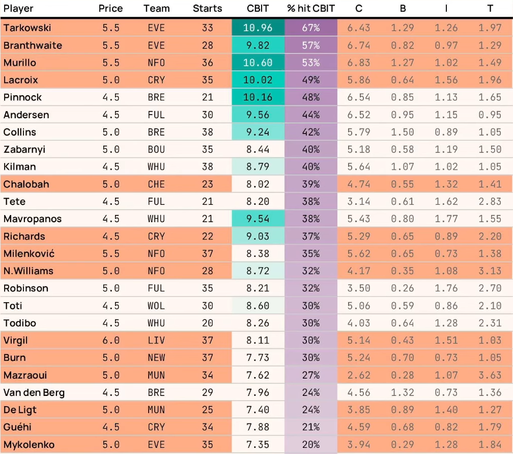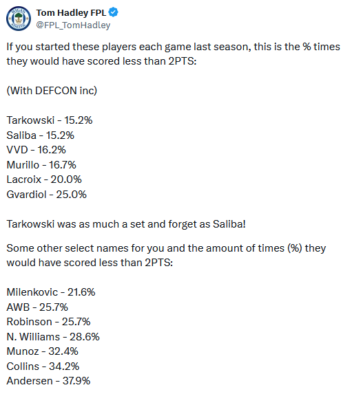 I came across a clever bit of analysis from Tom Hadley, who some of you might remember came on the channel when he was rank 1. What are we looking at here? With Defensive Contribution points factored in, he's measured the percentage of times a defender would have scored fewer than 2 points. Tarkowski and Saliba were the winners with only 15.2% of the time. This is interesting reading because it's answering the question, which defenders generally have the highest floor under these new rules. So about 1 in every 6.6 games, they'd have scored under 2 points. Van Dijk also fared extremely well with 16.2% of games, and Murillo was a defensive contribution beast and would have been on 16.7%.