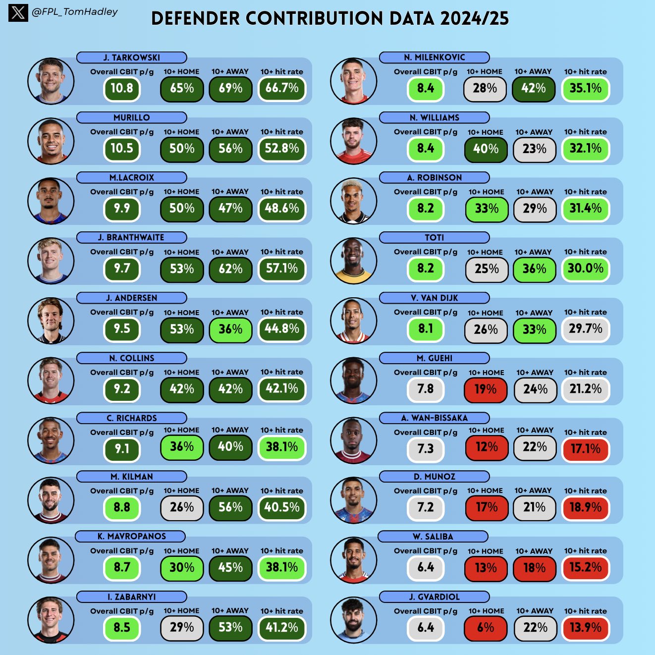 Defensive contributions are going to play a big part this season, so I'm trying to factor that in to my picks. Tom Radley from the Scout team has produced some fantastic graphics this pre-season on def con data, this measures average contributions per game, then the percentage of the time that players hit the 10+ threshold in home, away and overall. Tarkowski is miles ahead having his at least 10 in 66% of games, in second it's Murillo who hit it 52% of the time just over every other game. Tie that in with clean sheet potential and bonus potential there could be games where he hits 10 points for a clean sheet and no goal involvements.
