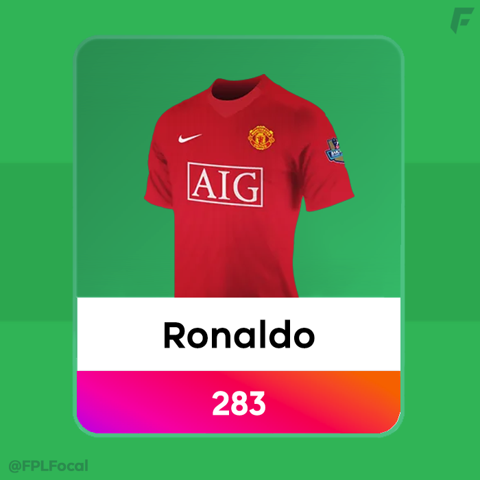 Cristiano Ronaldo is still a fixture in the team, from his penultimate 07/08 season with Man United. He got 284 points from a staggering 31 goals, and 6 assists, at a rate of 0.92 goals per game. That season Ronaldo did it all, scoring: