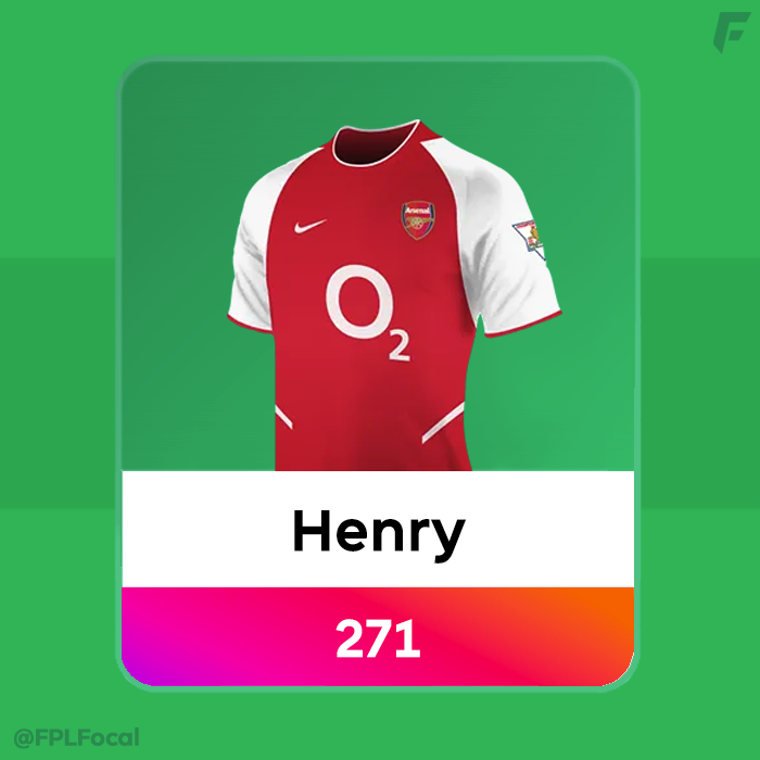 The final player in the team is who else but Thierry Henry 👑, who like Friedel still remains in the team from the season that FPL began, all the way back in 02/03. He scored 271 points, playing 37 games, scoring 24 goals, and getting 20 assists. His 20 assists is still the record to this day for the most in a PL season. Interestingly back then it was possible to play a 2-5-3 or 5-5-0 formation in FPL, not that you'd ever want to play a strikerless formation with Henry in the form he was in. The following season Arsenal would go on to have their iconic Invincibles season.