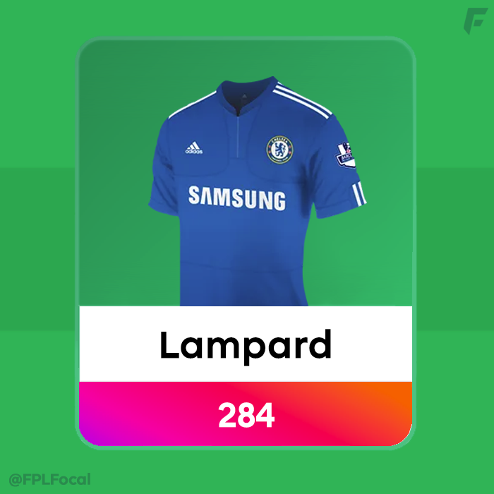 Next up is Frank Lampard, who finished on 284 points in the 09/10 season. He scored an impressive 22 goals from midfield, and picked up 14 assists en route to winning the league with Chelsea. Although both Salah and Lampard are considered midfielders on FPL, Lampard can be considered a true midfielder in footballing terms having played in a central attacking mid in all games.